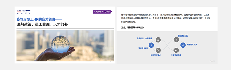 为了帮助众多企业人力资源工作者应对挑战,凯发k8官网国际联合国内知名律所“大成律师事务所”,推出疫情后《复工HR的应对锦囊》手册,从法律政策、员工管理、人选储备几个方面对企业HR有序召开复工后的各项人力资源管理给予帮助。